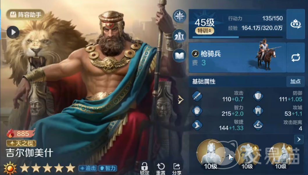 统率位置用吉尔伽美什,核心智力连击输出,他的核心技能英雄史诗,可以在普攻后再次对敌方2个单位造成一次智力伤害,并使其受智力伤害提升。另外2个技能携带加冕和天下当倾,加冕可以加暴击概率连击,天下当倾普攻后加暴击并追加智力攻击。兵种带枪骑兵、火鸦一代。加点走全智力加点。