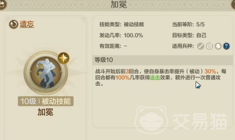 技能方面携带撞阵冲军和左右开弓,前者挺不错的A级追击技能,2回合内每回合都有几率普攻2次,并提升攻击智力属性。后者则是普攻之后概率再次造成一次攻击伤害,同时几率使得目标受伤提升。这套配队中的每个武将都有强力的追击技,腓特烈一世也能给到很多的增益。