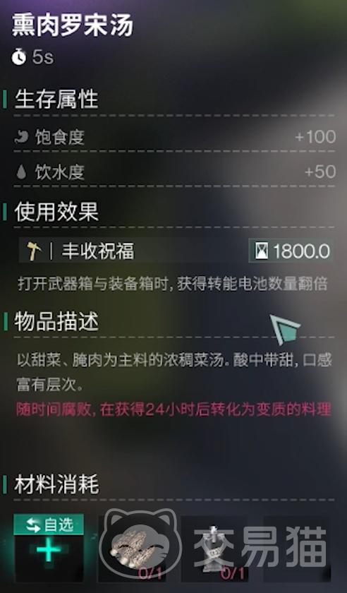 制作熏肉罗宋汤需要肉、羊肚菌和纯水。食用后能提升打开武器和装备箱时获得的电池数量,但在游戏前期难以获得羊肚菌,而到了后期,这点电池的增益也显得不那么重要。