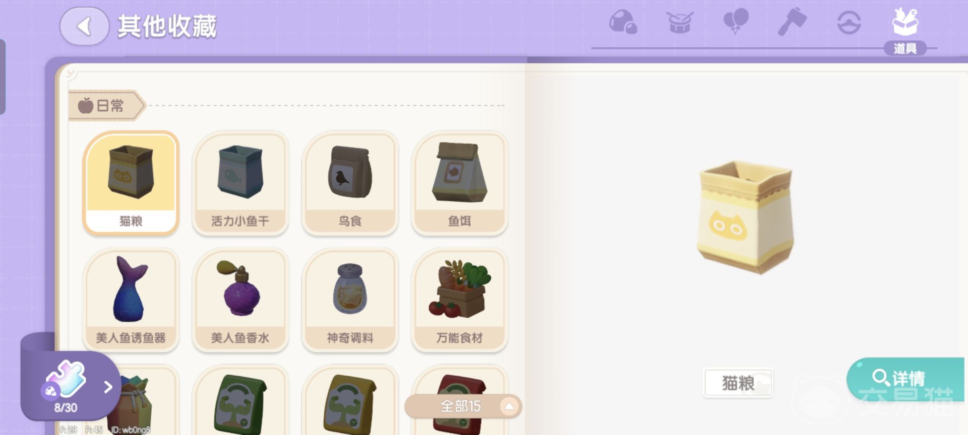 道具类有猫粮、鸟食、鱼饵、小鱼干、诱捕器、调料、繁育粉、肥料、生长素。