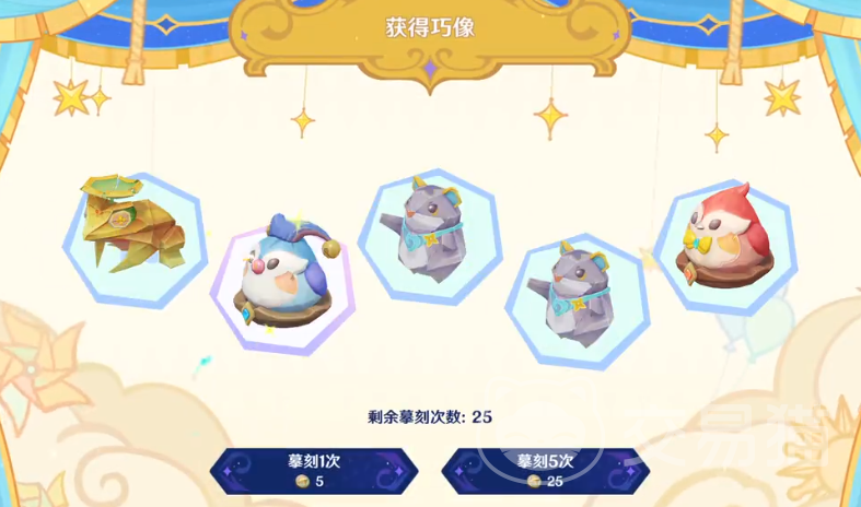 在这个扭蛋机这里会有两个选项,分别是消耗5个星游币篆刻1次,和消耗25个星游币篆刻55次,玩家可以根据自己的星游币数量,进行不同的篆刻次数选择,篆刻之后就会有扭蛋从扭蛋机里掉出来,每次玩家将会随机抽取到不同的角色,可以把这些角色放在区域的架子上,然后这个任务就能完成。