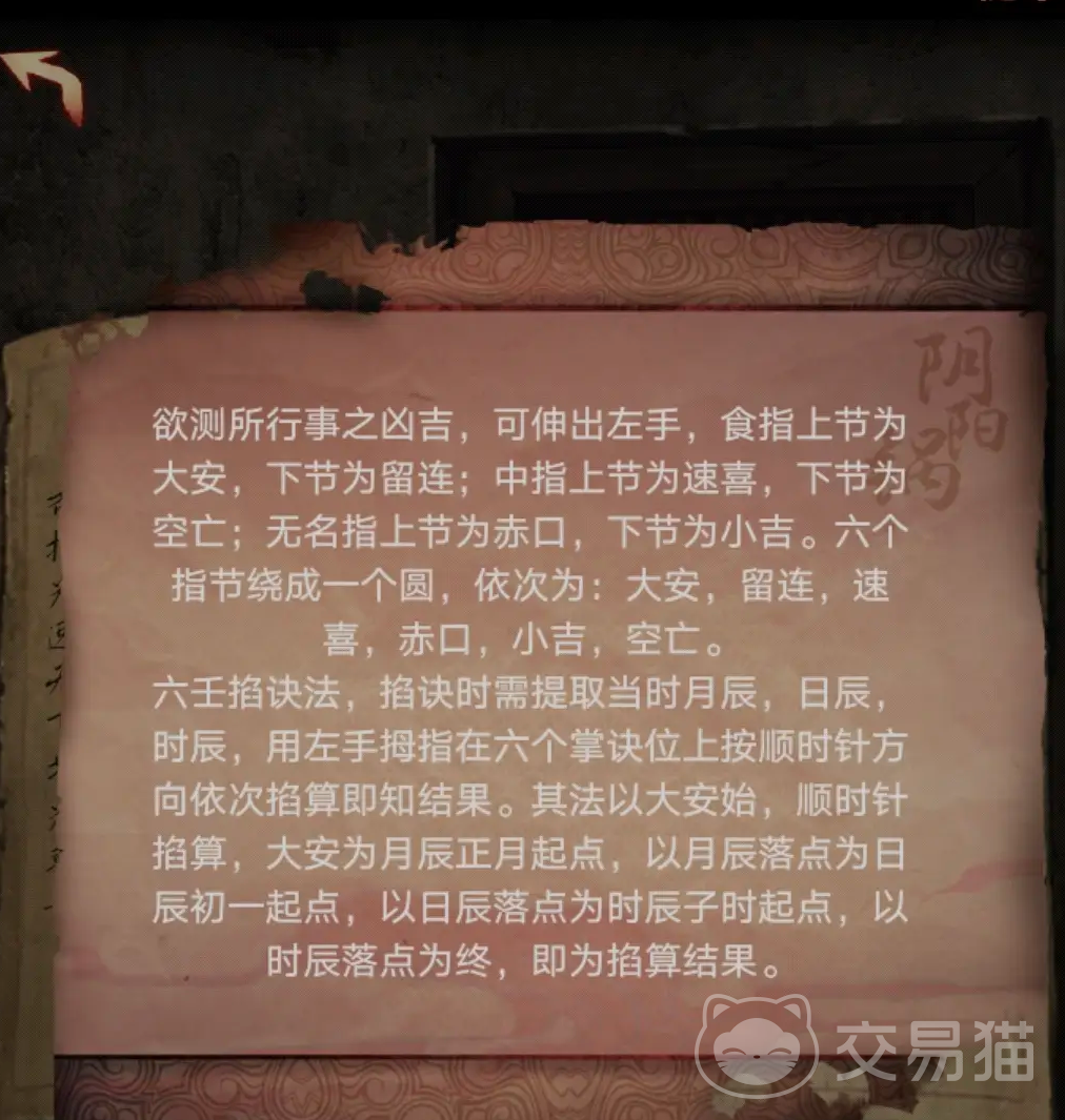 在游戏中,玩家会遇到多个需要应用六壬掐指法的场景。例如,在解开某个机关锁时,锁上可能刻有与月份、日期和时辰相关的线索,玩家需要按照上述步骤掐算出对应的状态,然后将这些状态按照一定顺序排列或输入到锁中,以解锁机关。