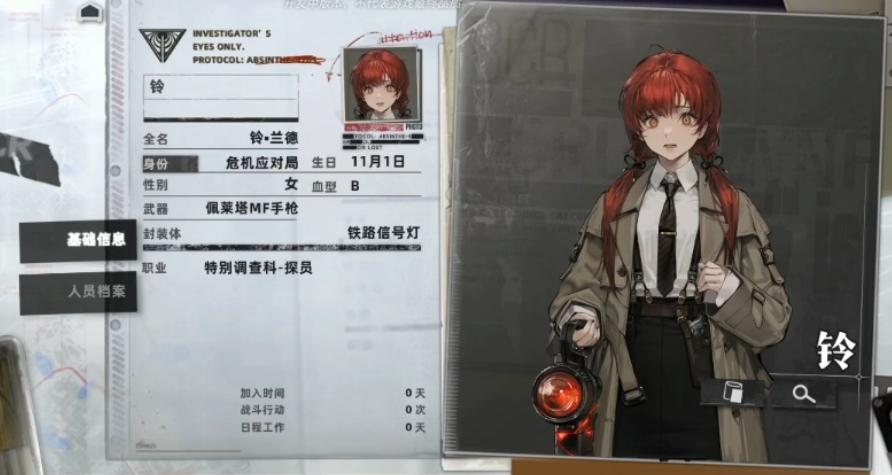铃探员曾经在白鲸咖啡工作,她对甜点充满热情,然而她的生活轨迹在被诺恩报告书选中后发生了改变,她被引领进入了一个崭新的世界也就是异象调查局,进入初级训练营后,铃由于缺乏战斗和调查的经验,在训练营中的表现并不出色。尽管如此后期她的潜力和对异象调查的热情使她获得了进入认知部的机会,担任联络员的职位,在认知部,铃探员迅速适应了她的新角色,她的工作主要是协调和联络,确保信息的流通和任务的顺利执行,一般都是以一个联络人的身份出现。