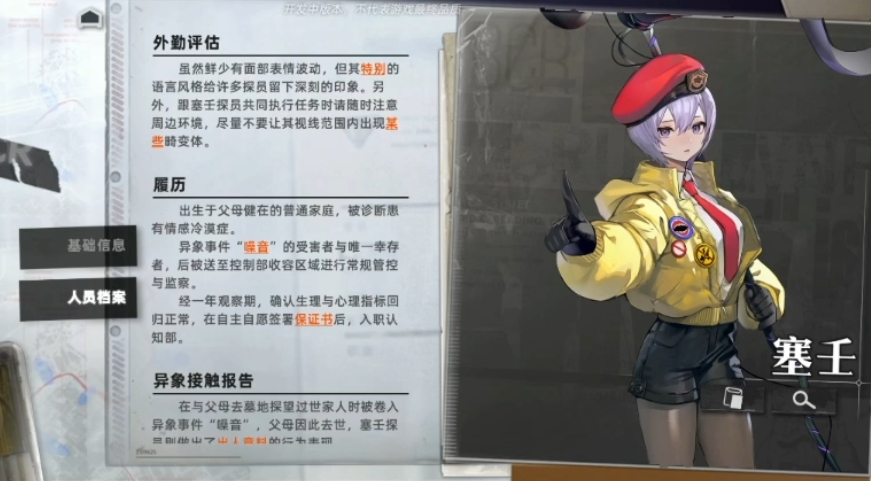 塞壬是一个因异象事件噪音而失去家人的幸存者,这一事件对她的心理和生理造成了深远的影响,原本塞壬跟她的父母和妹妹生活在一起,直到异象事件发生,在一次家族墓地探望过程中,他们被卷入了这一灾难性的事件,其中有一种异象实体对其视线范围内的所有生物进行无差别的攻击和捕食,所以塞壬的家人不幸遇害,而她则是唯一的幸存者,事件结束后,塞壬被送到控制部收容区域进行常规管控与监察,后期在自主自愿签署保证书后,她被允许加入认知部,开始她的探员生涯。