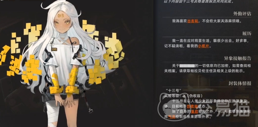 十三号在人设的设定上面是一个萌妹,看起来年纪比较小,说起话来是颠三倒四的,因为少跟人接触,所以看起来比较单纯,但是在这样剧情中大家不难推断,这个角色的身世绝对是有秘密的,她的生活和过去被高度保密,只有少数人能够接触到关于她的信息,真名也未知,是应对局内部的一个传奇人物,她几乎一直都在应对局的内部设施中度过,很少外出,因此她对外部世界充满了好奇和向往,由于她的特殊能力和潜在的风险,她的大部分活动和信息都被严格限制和加密。