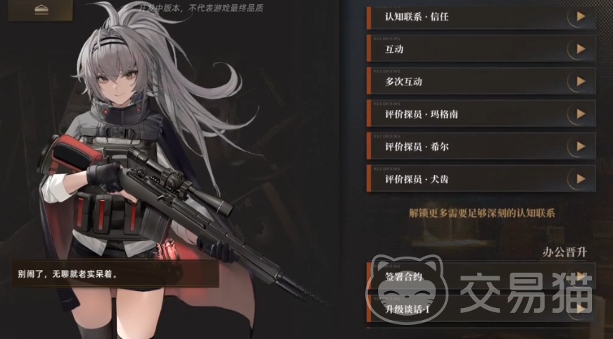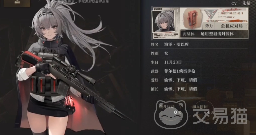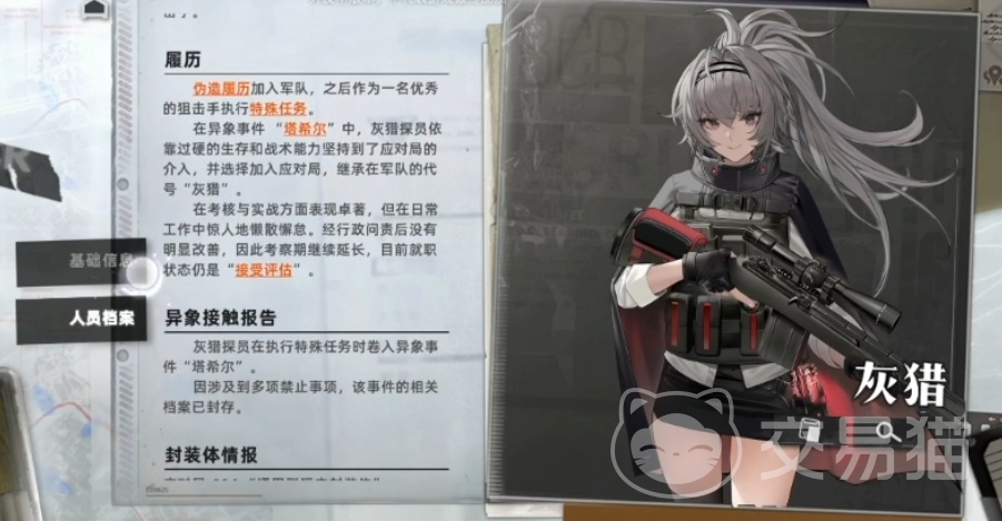 她在信息收集方面不擅长,因为她认为自己的真正价值应该在战场上体现,所以她的狙击枪不只是一个武器,而是她的眼睛,可以说这个角色是关于一个女强人的成长历史,灰猎的通用型狙击封装体仅提供了基础的抗模因干扰能力,还能够抵御异象带来的干扰。