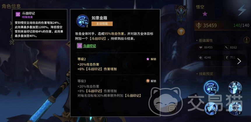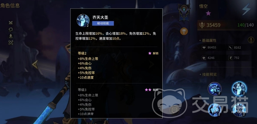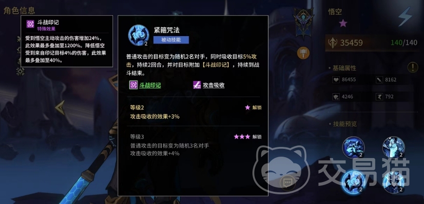 其次被动效果是能够给战斗能力进行全面提升,他的生命、会心、免伤、免控以及速度均大幅增加,这样悟空不仅能够承受更多的伤害,还能够更快速地发动攻击,第二个被动技能会将他的攻击目标变为随机两名对手,然后吸收他们的攻击力,并将其转化为自身的力量,这样的效果会持续2回合。