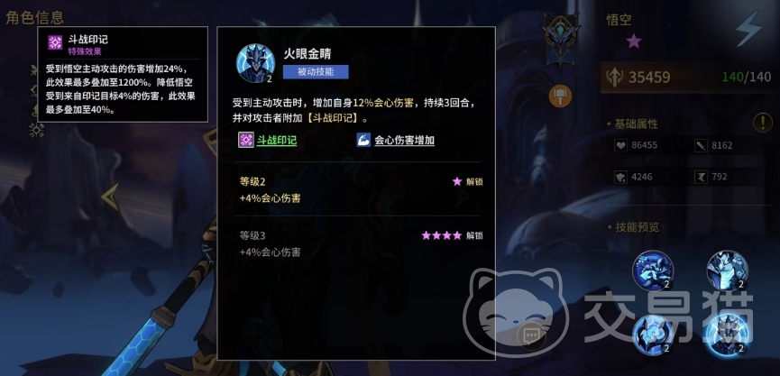 同时他在目标的额头上也回留下了一层斗战印记,使该目标后续无法逃脱,通过吸收敌人的攻击力,他能够不断强化自身,最后一个被动是敌人进攻时,大幅提升自身的会心伤害,这个被动持续时间最长有3个回合,同时还是会留下一个印记给对面,所以悟空的输出一般情况下都是需要依靠这个印记的。