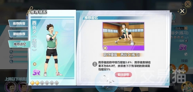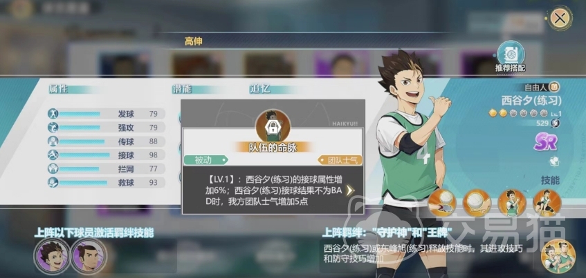 阵容搭配可以选择跟日向翔阳、飞雄、月岛萤一起上阵带来的效果是最好的,在羁绊上面西谷夕跟东峰旭一起上场可以出发羁绊,上阵羁绊是守护神和王牌,自由人西谷夕或东峰旭释放技能时,其进攻技巧和防守技巧会有增加,在追忆的选择上面大家可以选择防守增强,防守技巧增加3.6%,救球结果不为BAD时,携带者下次救球时的救球属性增加5%。