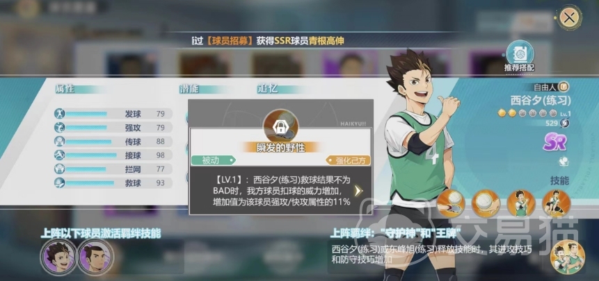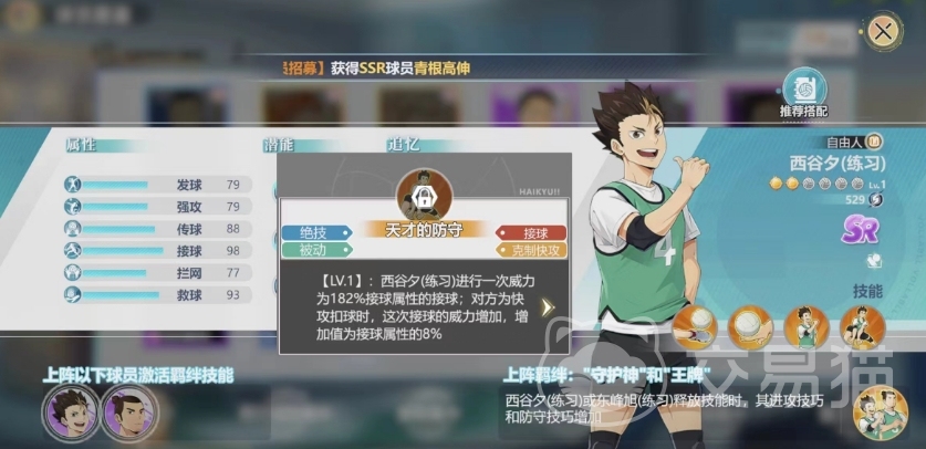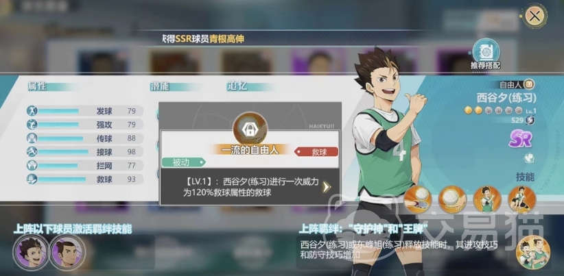 西谷夕在游戏中的定位就是一个自由人,作为sr级别的自由人,在效果上面也属于还可以的,就比SSR品质差了一点,所以小编还是比较推荐大家培养这个角色使用的,第一个被动技能是瞬发的野性,西谷夕救球结果不为BAD时,己方球员扣球的威力增加,增加值为该球员强攻/快攻属性的11%。