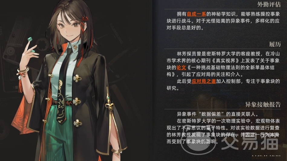 林芳探这个角色出现在剧情中的时候是以一个高知的情况出现的,她曾是密斯特罗大学的客座教授,她在期刊上发表了关于事象块的论文,这篇论文引起了应对局的注意,应对局对林芳的研究产生了浓厚的兴趣,并邀请她加入控制部,专注于事象块的研究,林芳的专业知识和技能使她成为处理异象事件数据偏差的关键人物,林芳探员在对实验数据进行复查时发现了事象块的存在,并因此受到了事象块的影响,使她获得了操控事象块进行战斗的能力,林芳的封装体事象块是高风险但潜力巨大的。