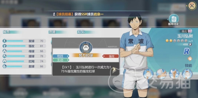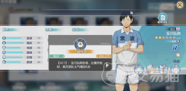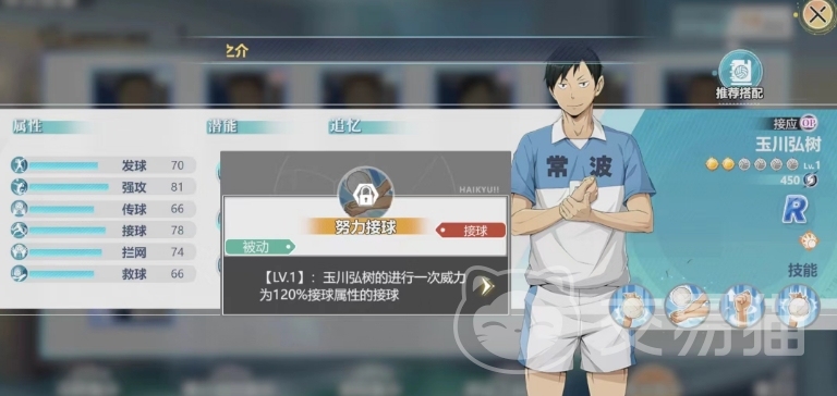 他作为一个r角色是常波高中当中的一员,接球效果也是不错的,目前这个角色因为品质比较一般是没有羁绊的,所以小编建议大家就在前期用就可以了,第一个技能是被动,可以带来玉川弘树的强攻属性增加7%的效果,这一被动技能直接增加了玉川弘树的强攻属性。