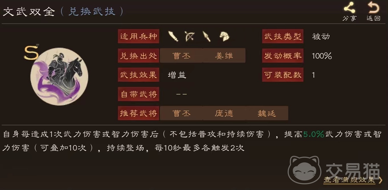 要想正确使用另外两个技能可以选择文武双全和折冲千里。文武双全是在自身造成武力或智力伤害后,提高武最多10%的武力或智力伤害,该效果能叠加10次,持续整场战斗,每10秒钟最多各触发两次,这样叠加到最后伤害就会非常恐怖。另外一个折冲千里对敌方两名武将造成智力伤害,还有几率将对方身上的正面状态驱散。