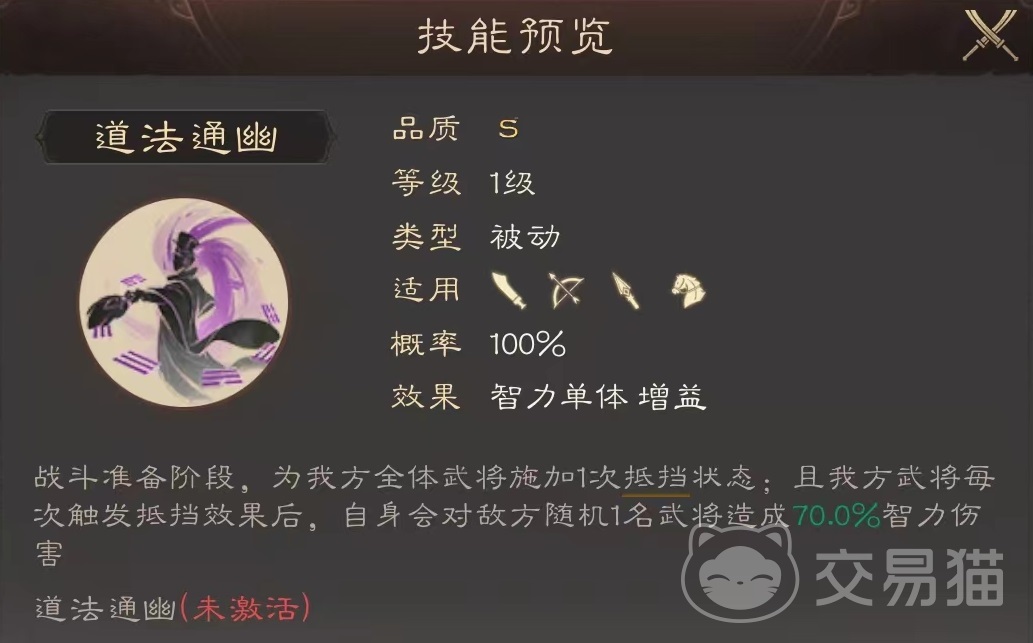 于吉自带的技能道法通幽,属于被动类型,在战斗准备阶段,为我方全体武将施加一次抵挡状态。抵挡属于正面状态之一,每次抵挡都可以免疫一次连击或主动技能所造成的伤害,且在我方武将触发抵挡效果后,自身都会对敌方随机一名武将造成智力伤害。技能在专属套装激活之后,施加的抵挡状态有50%概率增加一次,为自身施加时必定增加一次。能够添加抵挡是于吉最大的作用,当然还有抵挡后续所附加的伤害,如果大家可以做到正确搭配,该技能造成的伤害绝对不会低。