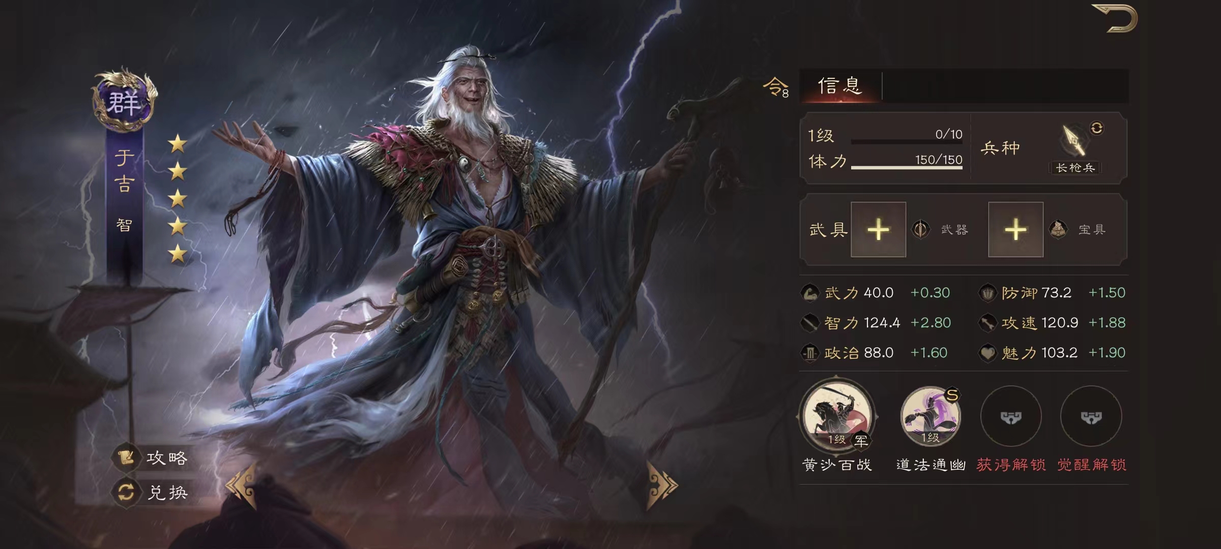 首先于吉在自身属性方面其实非常突出,无论是初始智力还是初始攻速都非常出色,尤其是智力属性,初始就达到了124.4,每提升一级还能增加2.8,这样高的智力可以让很多技能发挥出极强的效果。自身的军师技能也很有特点,黄沙百战,军团中所有武将在非玩家战斗中获得的经验提升15%。