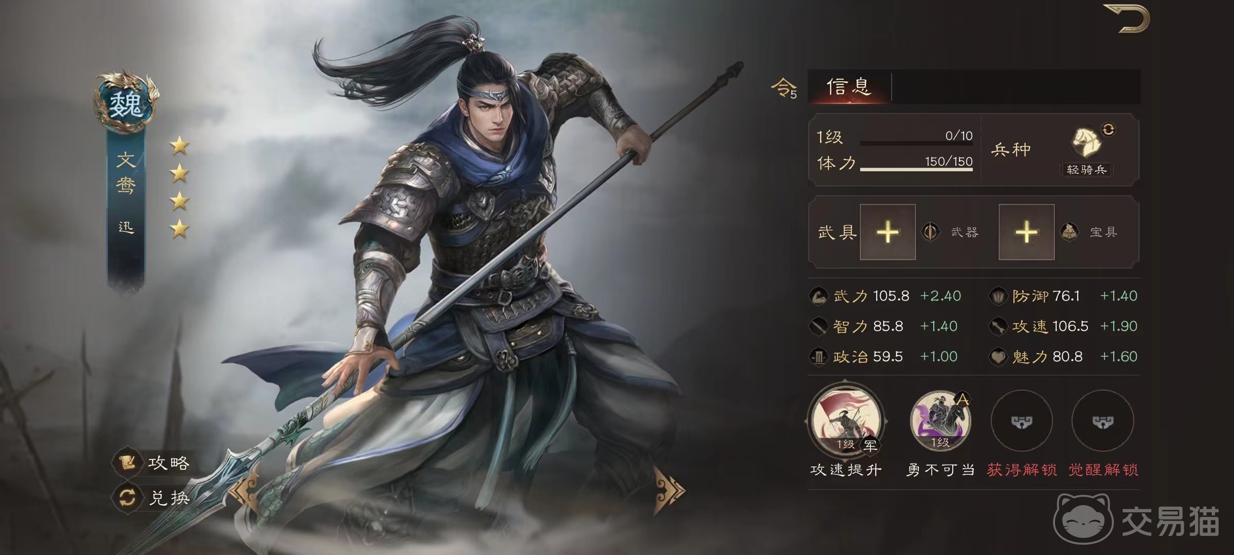 文鸳虽然品质不高,但也具有军师技能攻速提升,军团中所有武将攻速提升最多9点,聊胜于无。在属性方面,武力是最强的一个,它的初始武力为105.8,每提升一级增加2.4,这样的武力成长已经算比较出色的一个。他所率领的兵种为骑兵,可以在轻骑兵、重骑兵和象骑兵之间进行激活。