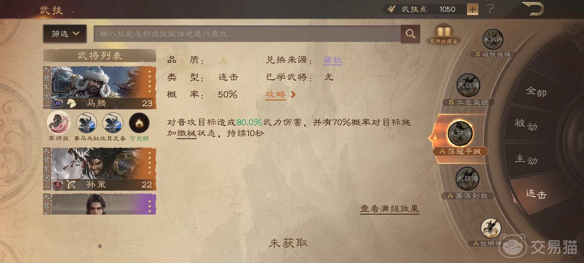另外两个技能小编推荐选择荡寇平贼和击溃,对普攻目标造成武力伤害,并有几率对目标施加缴械状态,持续10秒钟,缴械之后对方就不能进行普攻,这样也有了一定的限制效果。另外一个击溃,对普攻目标施加溃散状态,持续20秒钟,溃散之后每两秒钟就会造成一次武力伤害,叠加起来也是很可观的,另外可以选择的技能还包括突进等。这些技能只需要低品质武将就可以直接兑换得到,对玩家来说没有任何负担,可以随时上场。