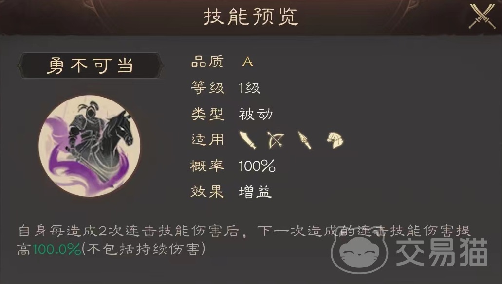 自带技能勇不可当,自身在造成两次连击伤害后,下一次造成连击技能伤害提高最多200%,这里不包括持续伤害类型,从自身所带的战法效果来看还是比较出色的。也是一名不错的输出型武将,虽然成不了核心,但可以发挥出技能优势,另外两个战法选择也很关键,一定要发挥出连击所带来的效果。因为自身品质并不高,所以搭配的技能品质也可以选择一些比较基础的类型,这样能快速形成战斗力。