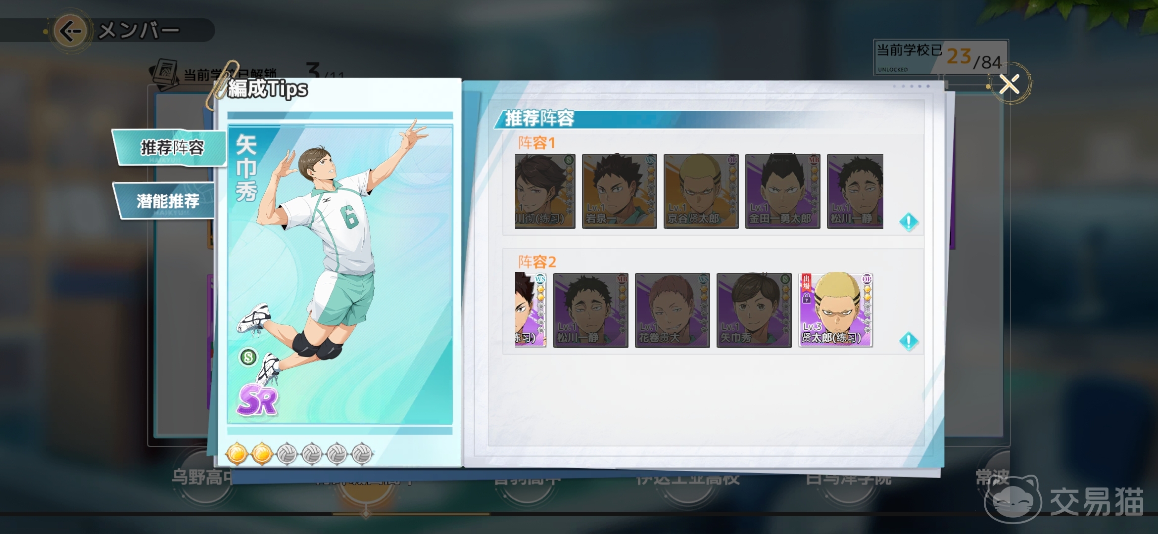 阵容搭配上还是以青叶城西高中其他球员为主:及川彻、岩泉一、松川、花卷和京谷;前期培养练度不足的话可以先使用岩泉一和京谷的练习sr紫卡版本,这套阵容是以强攻为核心的,及川彻作为主二传手,而矢锦秀主要是为阵容提供一个辅助传球加成,不断的叠加进攻节奏buff来提升,其他主副攻手的强攻威力。