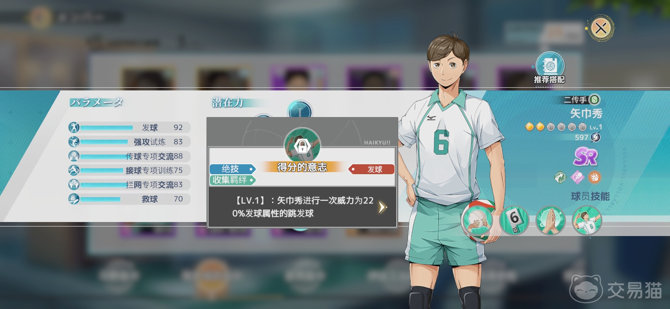 矢巾秀绝技得分的意志在释放的时候可以在开局内发出比较少有的跳发球,威力更大而且不容易判断反弹路线,捍卫尊严提升全场队友的传球属性意识和反应,而他另外两个被动也会给他增加一部分传球属性,这让矢巾秀有着较强的团队增益能力,特别符合二传手在排球游戏中的职业设定。