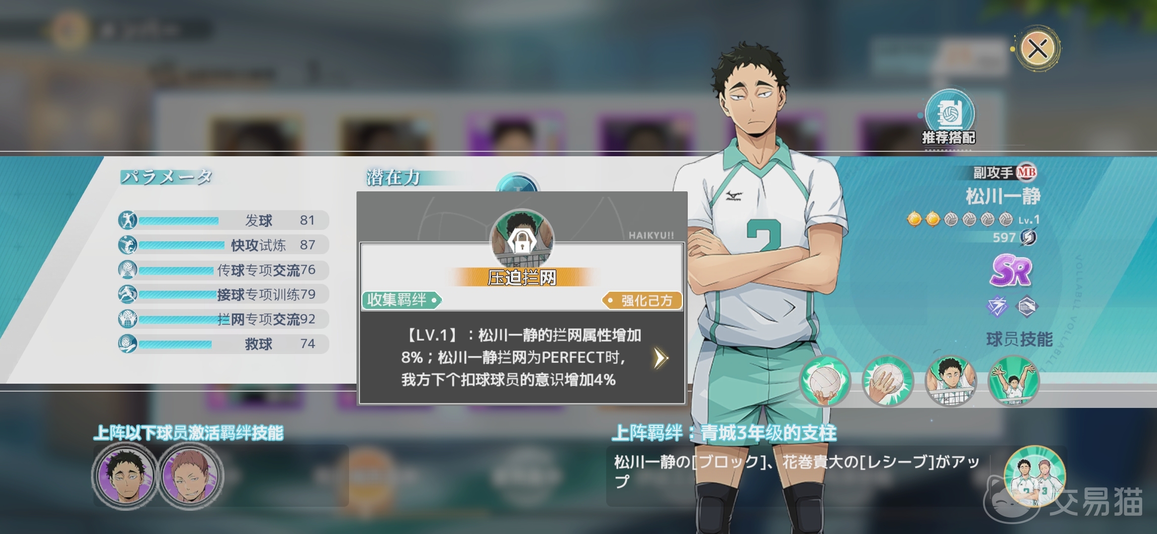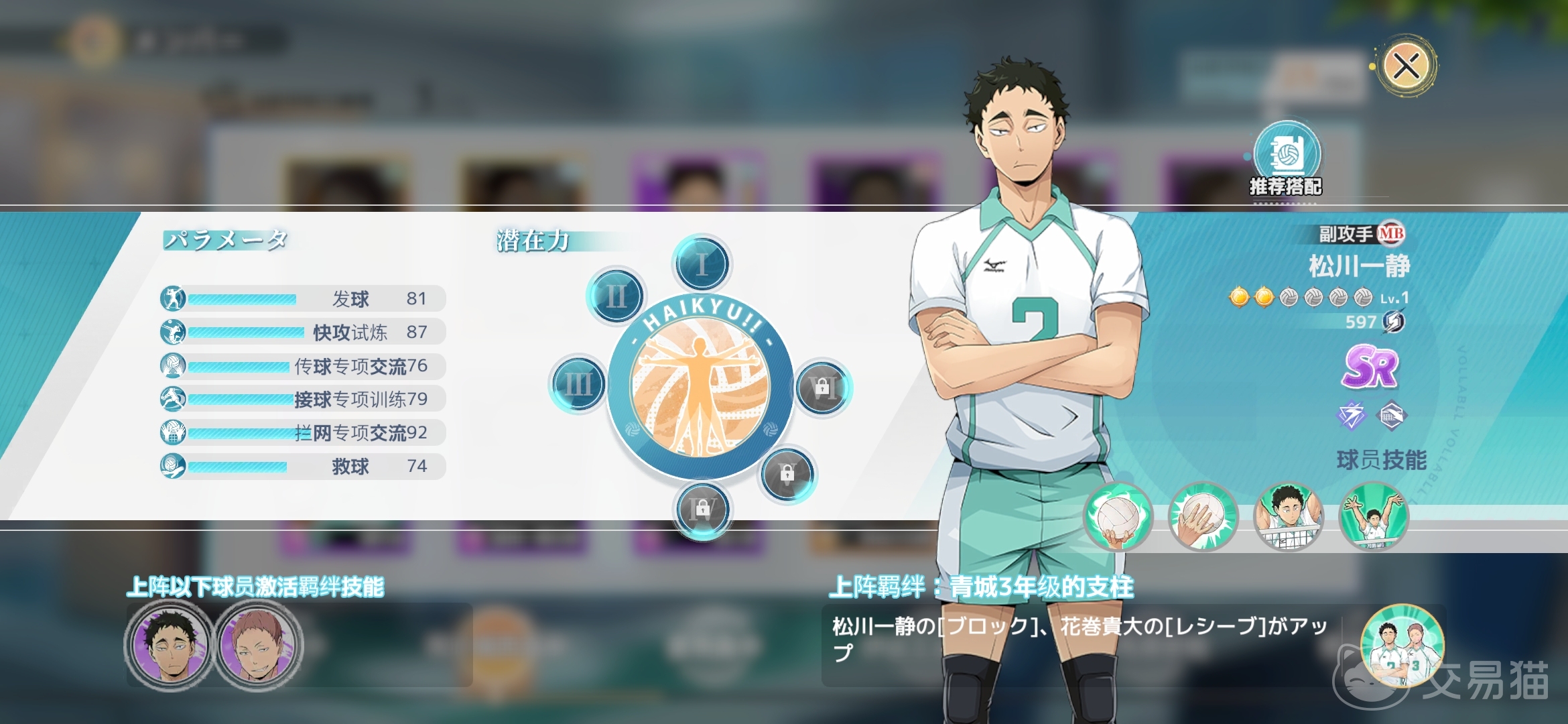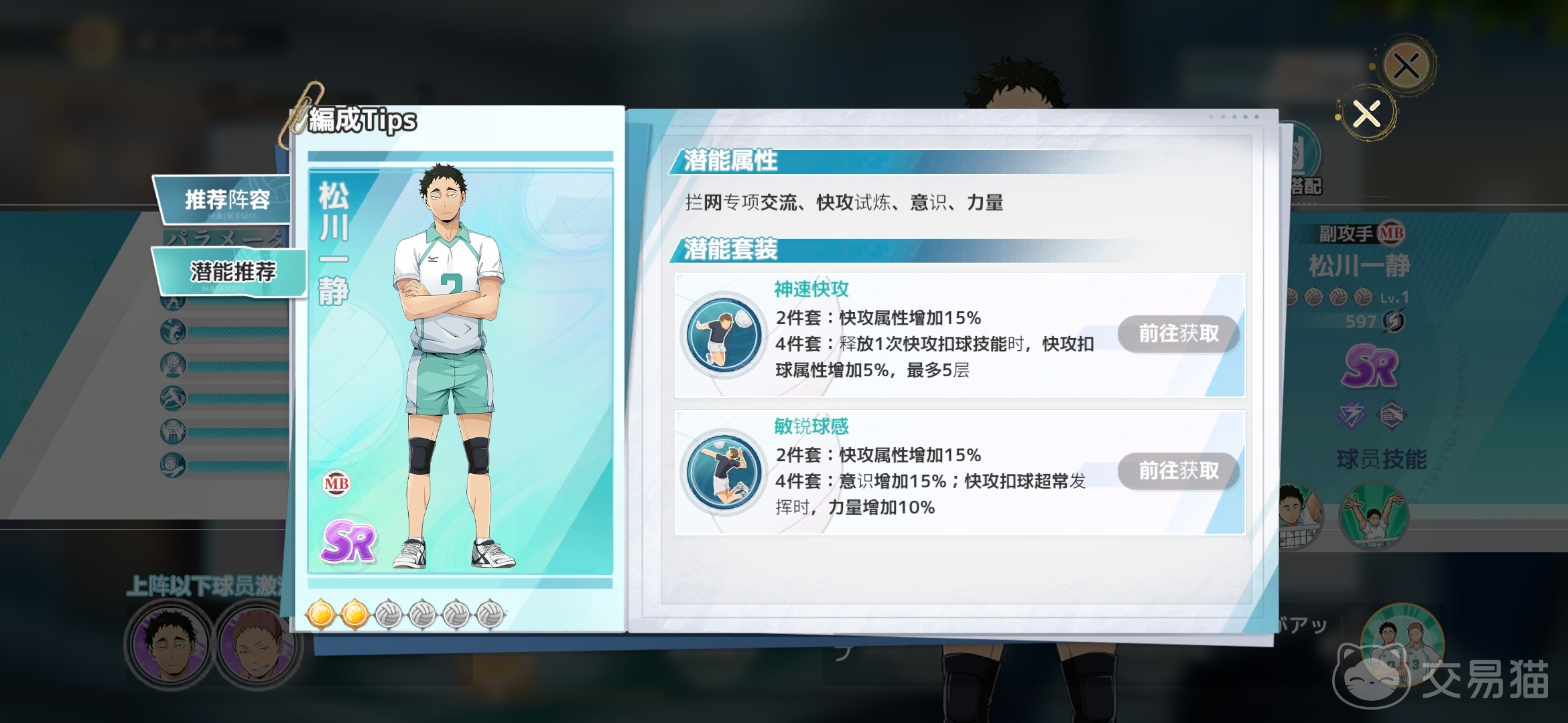 以上就是关于松川一静球员的所有相关内容介绍,青叶城西高中一个不能忽视的前期很强的副攻mb位置是非常值得培养的,属于sr卡牌中前期就很强的拦网选手,希望对大家有所帮助。