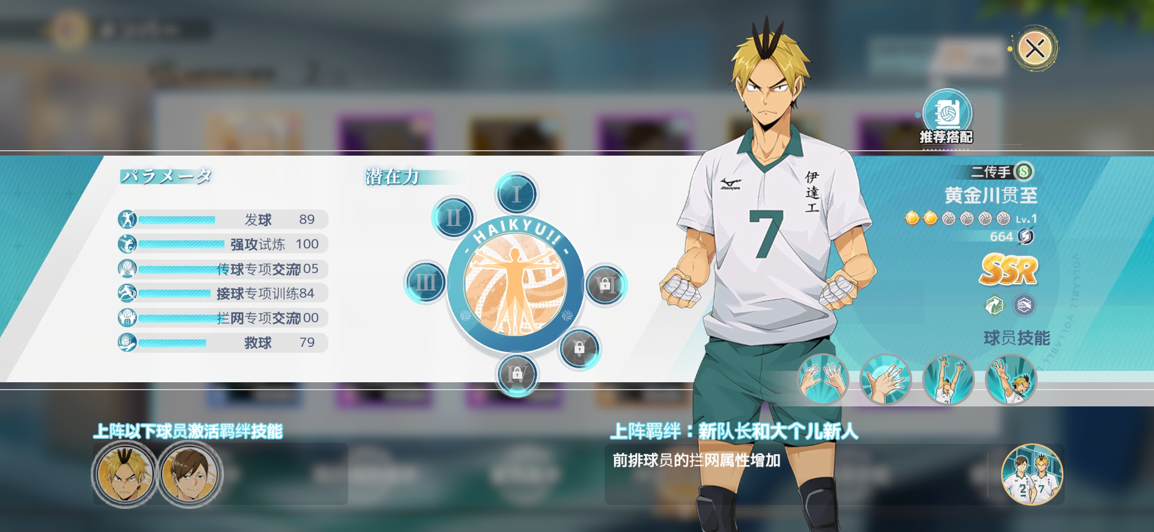 黄金川贯至身高也将近两米,身体素质和臂力都极为出色,一开始来到伊达工业高中的时候技术并不太好,奈何有身高优势逐渐的越来越能够承担二传手拦网的身份,游戏内的设定和他的人物传还是比较相似的,不亏是一张ssr卡,完全能够扛起队伍二传手的大旗。
