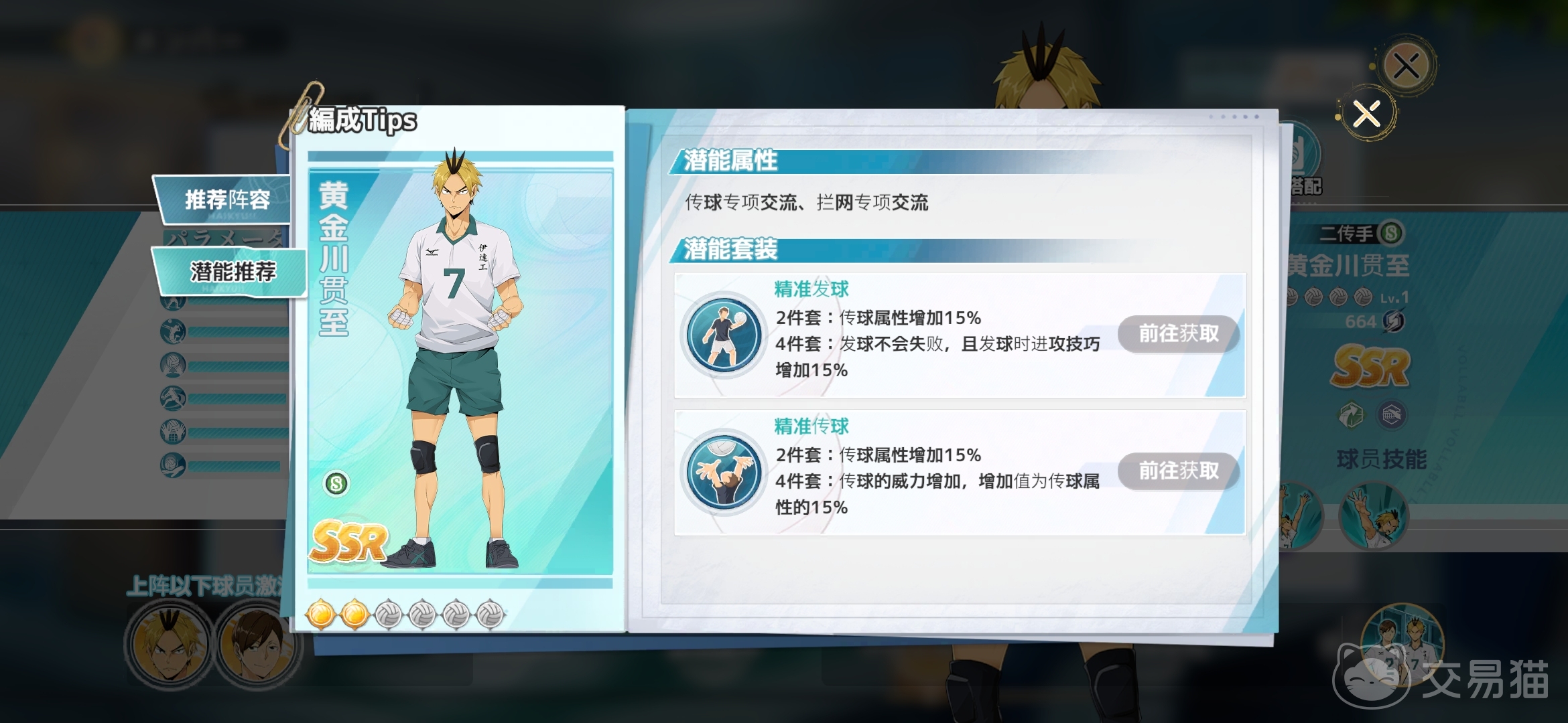 黄金川贯至能够在同一球队的青根的加持下打出非常不错的拦网效果,而本身传球属性和加成比较高,所以可以很好的克制乌野高中的快攻打法,具体还要根据角色练度来判断,希望能对各位小伙伴有所帮助。