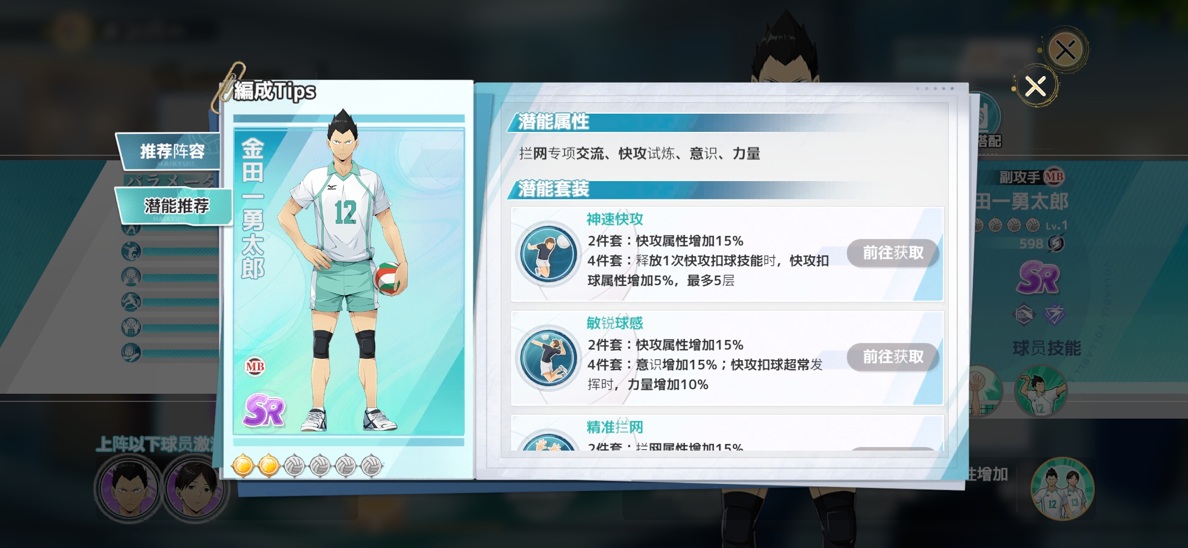 关于排球少年手游金田一勇太郎技能强度目前到这里就介绍完了,如果小伙伴们主玩青叶城西队的话,它是必不可少的一个存在,十连抽出他的概率很高,记得适当培养即可。