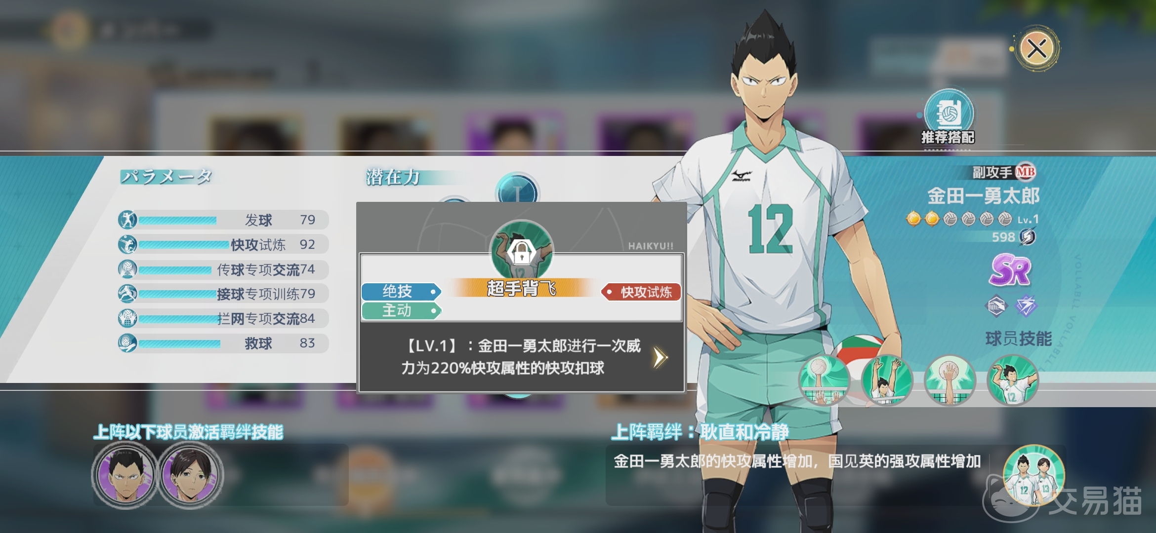 金田一勇太郎和松川两个在游戏中担任的是副攻手的位置,无论是在动漫还是游戏内他都更为冷静,超手背飞进行一次220%的快攻属性扣球,数值算相当高了;变态的还是他的关键一击,自身增加8%的意识和力量,对他的各项操作精准度打下了更坚实的基础;而超高度拦网取决于他的身高,光有防守能力肯定也不行,高点扣球则是在快攻扣球的时候减少对方的拦网威力。