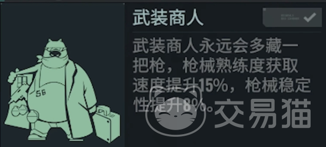 武装商人的自带效果是提升武器15%的熟练度,和枪械8%的稳定性,这个效果能让新手小伙伴提高初期的命中率,保证生存,本身就有射击技巧的玩家,有了这个效果还能大大缩短任务的完成时间。