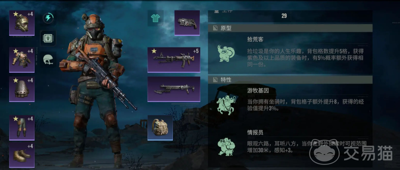 拾荒者受欢迎程度非常高,恰恰也说明这个原型的综合能力比较强,拾荒者的效果是提升五格的背包格子,当获得紫色或以上品质的装备时,有5%的几率得到相同装备,拾荒者虽然没有保安的生存保障,但是在前期的时候就能因为充裕的背包格子,比别人获得更多有用的物品,提高综合战力。