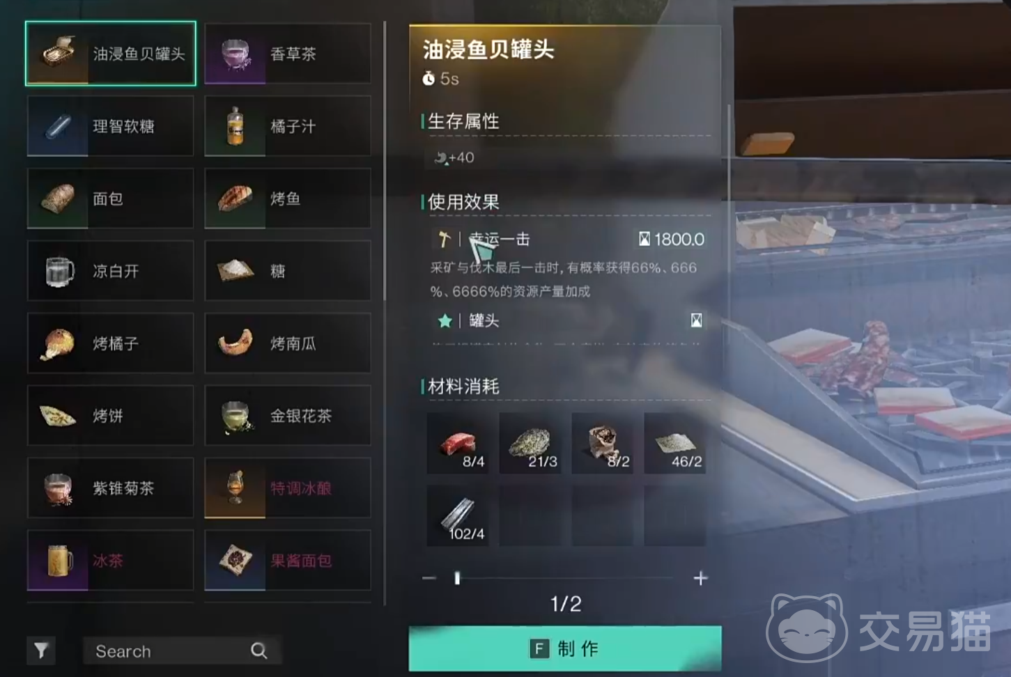 香料的获取方式比较麻烦,需要到各个城镇的垃圾箱里面进行翻找才能找到,但是只需要两个也不是很困难。铝锭则是在铝矿里面开采完以后熔炼就可以了,材料集齐以后烹煮半个小时就能拿到这个罐头了,它的效果是在采矿的最后一下可以有一次概率暴击,最多能达到6666%的数量暴击,相当于一块材料直接变成66块,相当暴力!