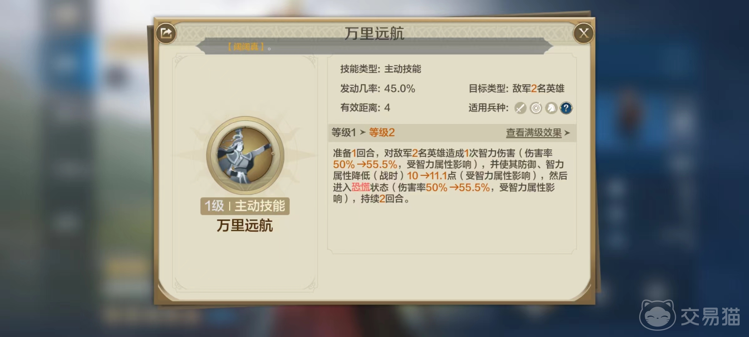 阔阔真自带的技能是主动类型,达到满级时有45%发动几率,有效距离4格。需要准备一回合,然后对两名敌方英雄造成一次智力伤害,并降低对方智力和防御属性最多20点,随后使其进入恐慌状态。恐慌属于减益效果之一,对方会持续受到智力伤害,在每回合个人行动时生效,恐慌能持续两个回合。所以阔阔真在智力伤害之余还能够削弱对方属性,这样可以弥补自身在面板上的一些缺陷。