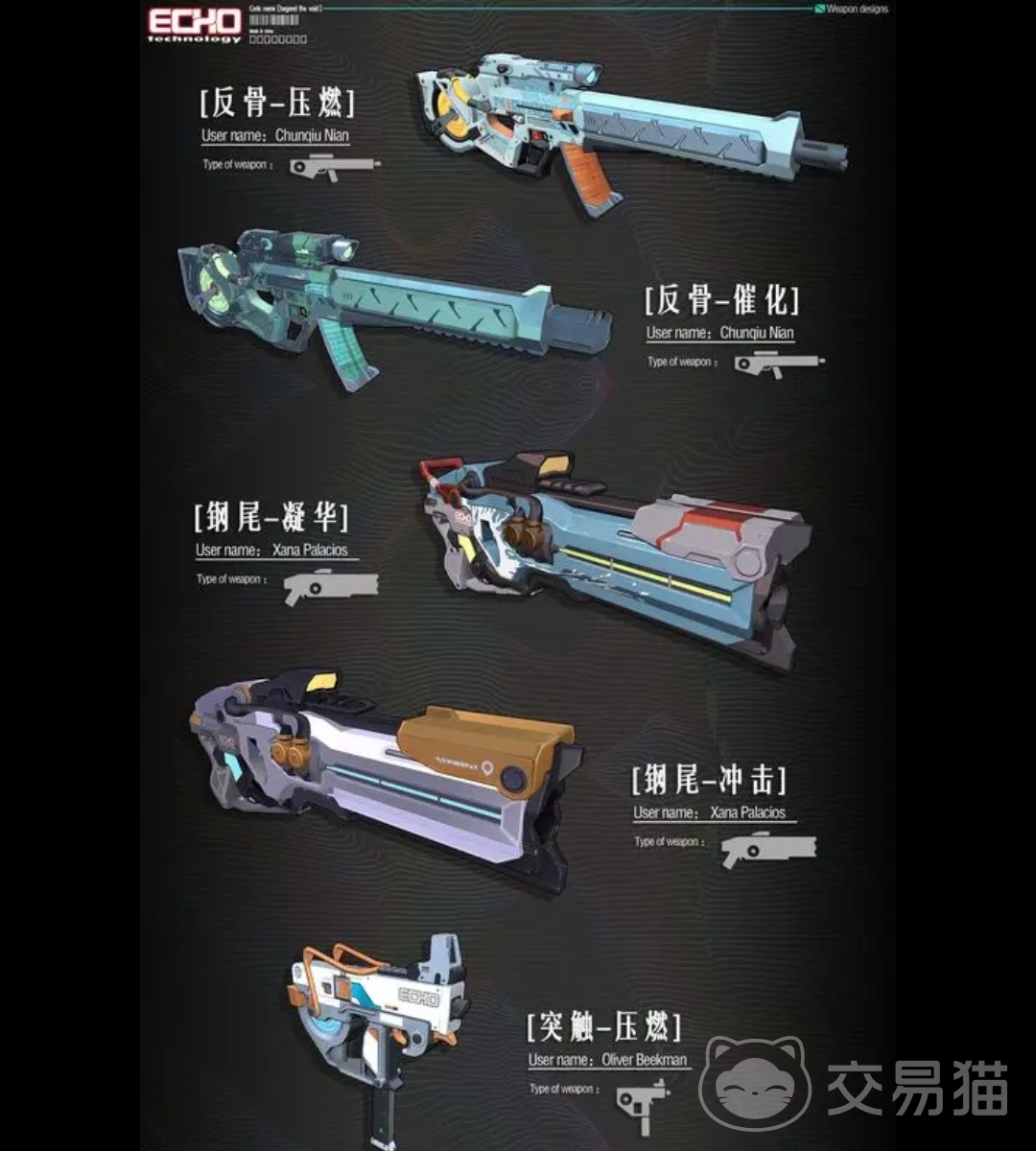 回声这个厂牌主要装备的设计都与科技有关,并且制作的核心理念也是创生反应,在游戏中,主要是对生命体来直接的造成影响,这个厂牌在科技合作社中也拥有了显著性的地位,特别是在医疗科技领域方面,除此之外,武器装备的制造上面也有不俗的实力,这些武器装备的外形主要是为了延续90年代早期的电子设计,更加具有轻工业的美感。