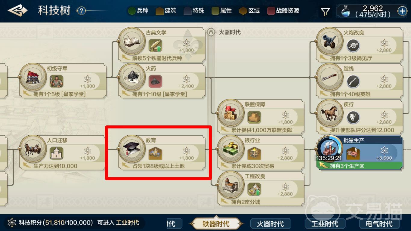 大学作为一种全新建筑,前提条件是研究完点亮“教育”。教育是属于铁器时代末期的科技,如果希望速度快一点,有个加速30%的前置条件是占领1块8级以上土地。队伍评分大约在15000以上可以尝试去打一下8级矿,最好找克制的;如果比较困难,也可以在8级矿边先放一个要塞,这样方便主力打出平局后快速撤退,在要寨中补充兵力再次进攻。