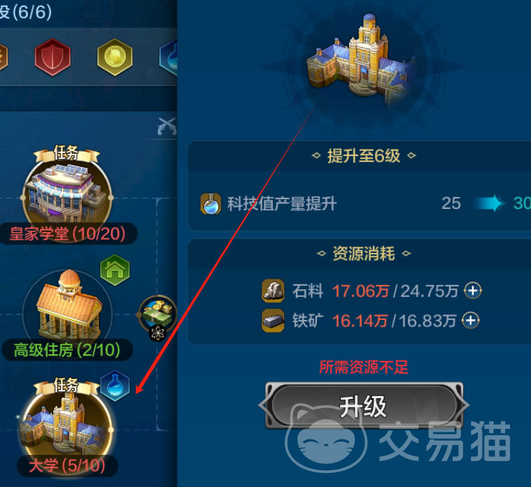 大学还能进行不断升级,进一步提升科技值产量。不过随着等级越高,需求的资源也越多,而产量提升每级都只是5;所以从性价比来看,每个城市都优先升低级,逐级依次提升,而不是仅拉升主城忽视分城。