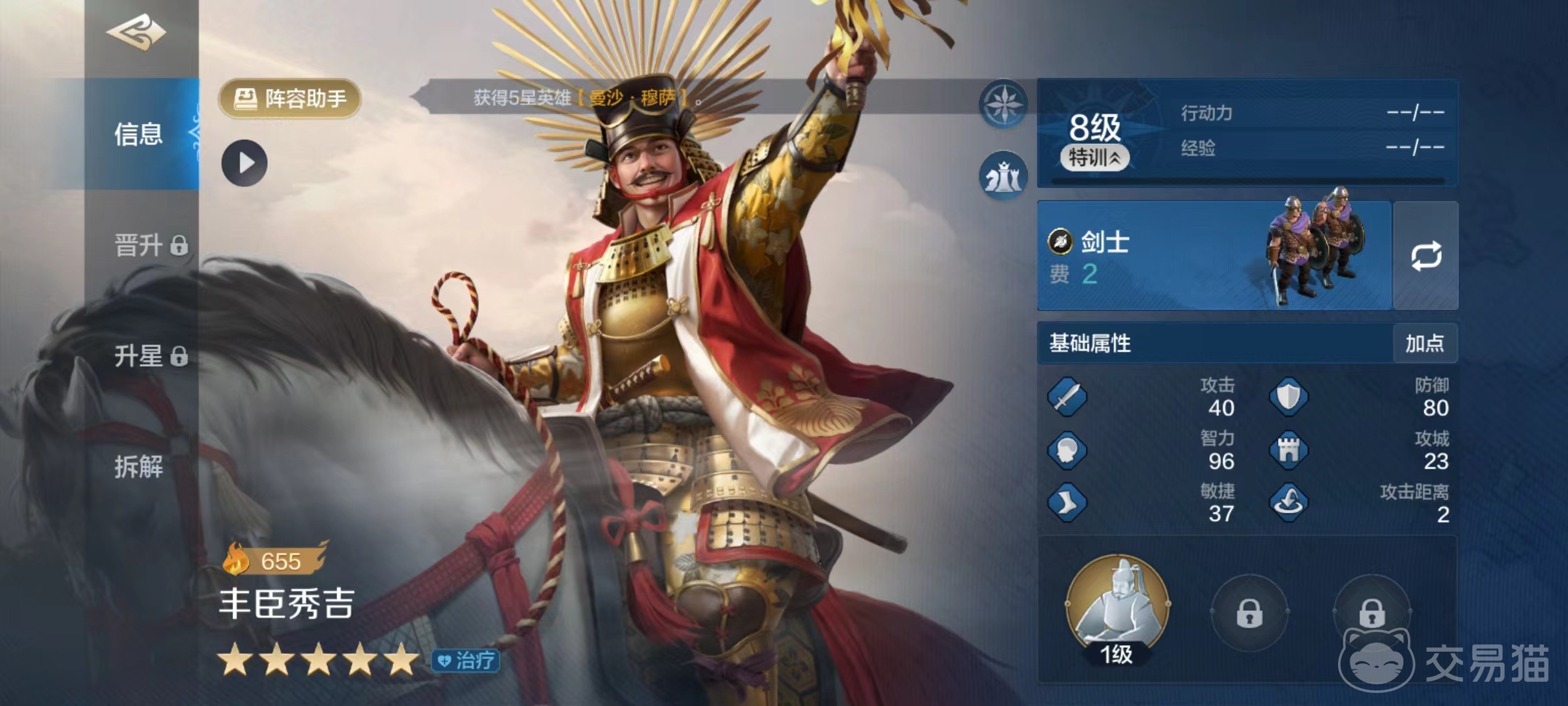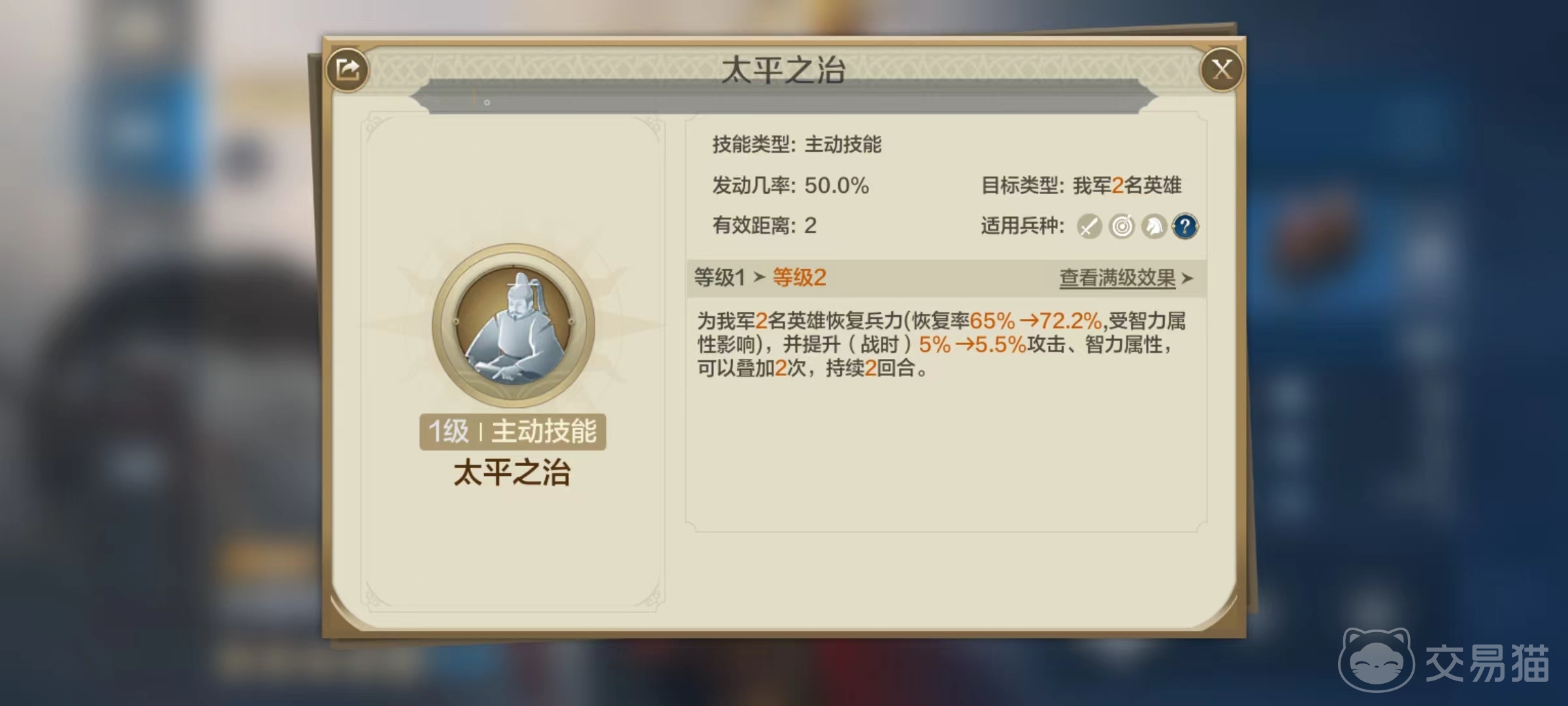 先来看一下丰臣秀吉自带技能的特点,它自带的太平之治属于主动类型。达到满级时有50%的几率发动,为两名我方英雄恢复兵力,效果受智力属性影响,并且提高10%的攻击和智力两项属性,可叠加两次,持续两回合。如果该技能可以频繁发动并触发几率比较好,那么提升的属性绝对是输出英雄的最爱。在另外技能搭配过程中,也要考虑到自身的治疗和增益等特点。
