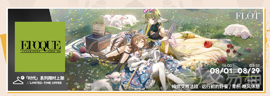 活动期间会推出“时代”系列和“错位巡礼”系列的多款新换装,纯烬艾雅法拉、青枳、夜莺、赫德雷、温蒂。往期“珊瑚海岸”系列的的几款时装也同期复刻,比如史尔特尔、羽毛笔、极境、至简的皮肤。
