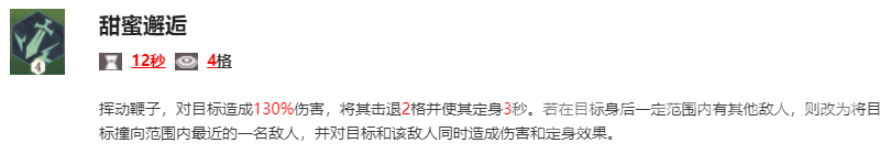 甜蜜邂逅:是阿塔兰忒的位移和控制技能。她挥动鞭子对目标造成伤害,并将其击退一定距离并定身数秒。如果目标身后一定范围内有其他敌人,她还会将目标撞向最近的敌人,并对两者同时造成伤害和定身效果。这个技能在团战中能够发挥巨大的作用,不仅能够对敌人造成控制效果,还能通过位移效果帮助阿塔兰忒调整位置,更好地输出伤害。