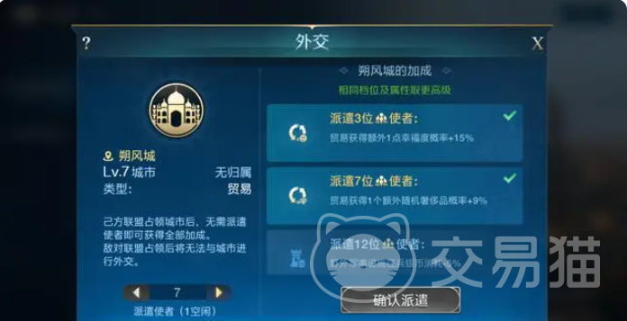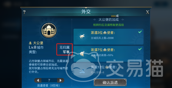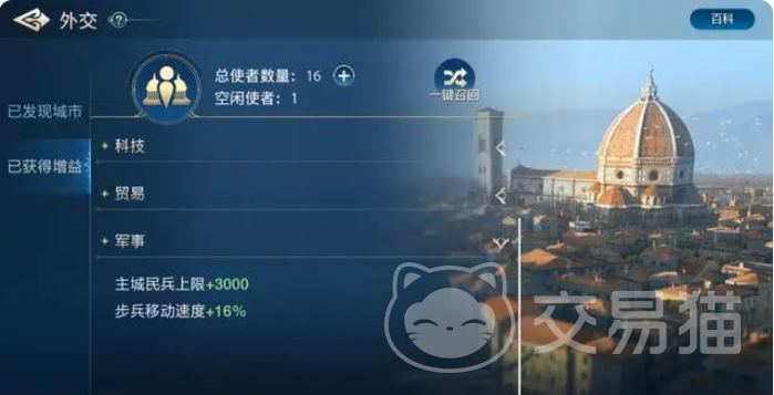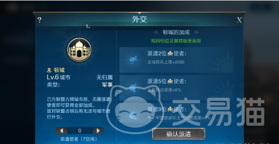 先来了解一下城市外交的基础条件吧。第一点是需要在首次获取城市视野之后才能进行外交,但是盟友之间是可以共享已经发现的城市的,这时候加入联盟的重要性就显现出来了。跟城市进行外交是要派遣使者的,使者数量上线是在主线任务当中获得的,派遣使者数量不一样,那么外交获得的增益效果也不同。