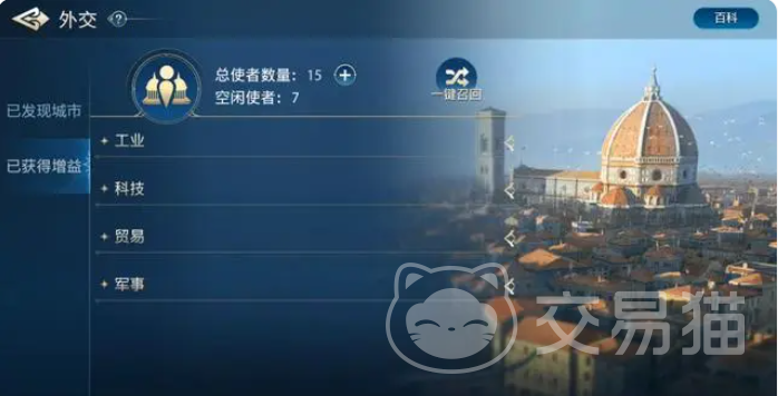 还有就是增加民兵上限的增益也是挺基础了,比较好用,如果是不以军事为主也是能考虑要一个的。如果是处于文明发育阶段,那么主要就将工业以及贸易城市作为主要外交对象。