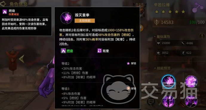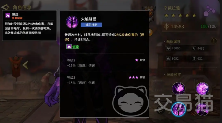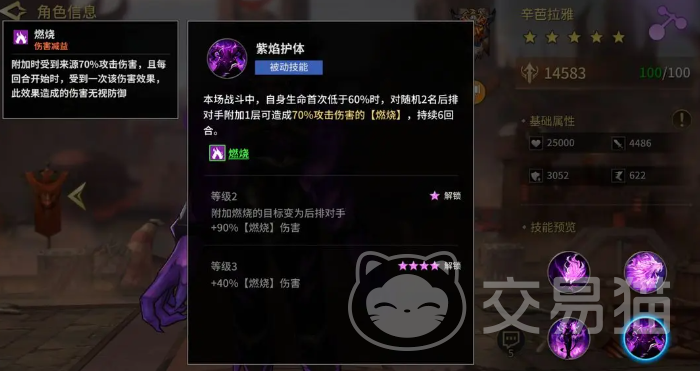 在战斗中,当辛芭拉雅的生命值首次低于一定程度时,她能够对后排敌人附加持续6回合的【燃烧】效果,造成大量持续伤害。辛芭拉雅的被动技能“紫焰护体”是她成为当前版本强势献祭流派核心的重要原因。当辛芭拉雅的血量首次低于60%时,她能够为两个随机敌方单位叠加持续6回合的燃烧伤害,这个伤害基于她70%的攻击力。当技能达到9星时,燃烧伤害更是提升至惊人的200%,并且影响的范围扩大到敌方全体后排。在献祭流队伍中,辛芭拉雅无疑是一个极其优秀的“祭品”。