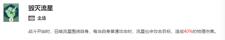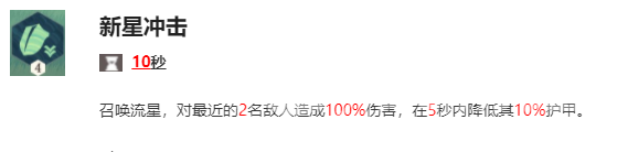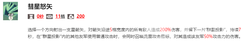 彗星怒矢:能够在战斗开始时对敌方半场所有敌人造成伤害,并留下一片群星投影。在这片投影中,己方英雄使用普通攻击时,会同时召唤流星攻击目标,对其造成额外伤害。这个技能不仅有着强大的范围伤害能力,还能够为队友提供强大的支援。随着技能等级的提升,伤害和支援效果都会逐渐增强。可以先使用“彗星怒矢”对敌人造成范围伤害并留下投影,然后利用“星光追袭”和“陨星召集”对敌人进行单体和范围打击。同时,不要忘记使用“星辰眷顾”来提升团队的整体战斗力。