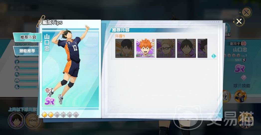 整体阵容搭配为影山、翔阳(练习版也可)、月岛、山口和西谷,这套阵容的二传手是以快攻为核心的,影山的技能可以不断提升球员的意识和力量,而西谷练习版就可以提升扣球能力,对局节奏比较快。