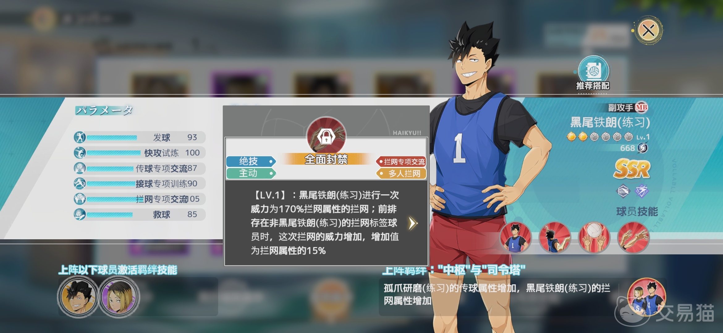 全面封禁:主动绝技,如果前排队友没有拦网羁绊,他的拦网威力就会大大加强;稳步进攻:黑尾获得自身所有速攻加成的攻击威力,队友的加成也算作在内;达人气质和篮网司令塔:分别是增加我方球员的力量和拦网属性。整体技能目的是为了让黑尾在比赛中多接球,从而为骨爪研磨获提供增益,他和灰羽相辅相成,筑成了一座拦网司令塔。