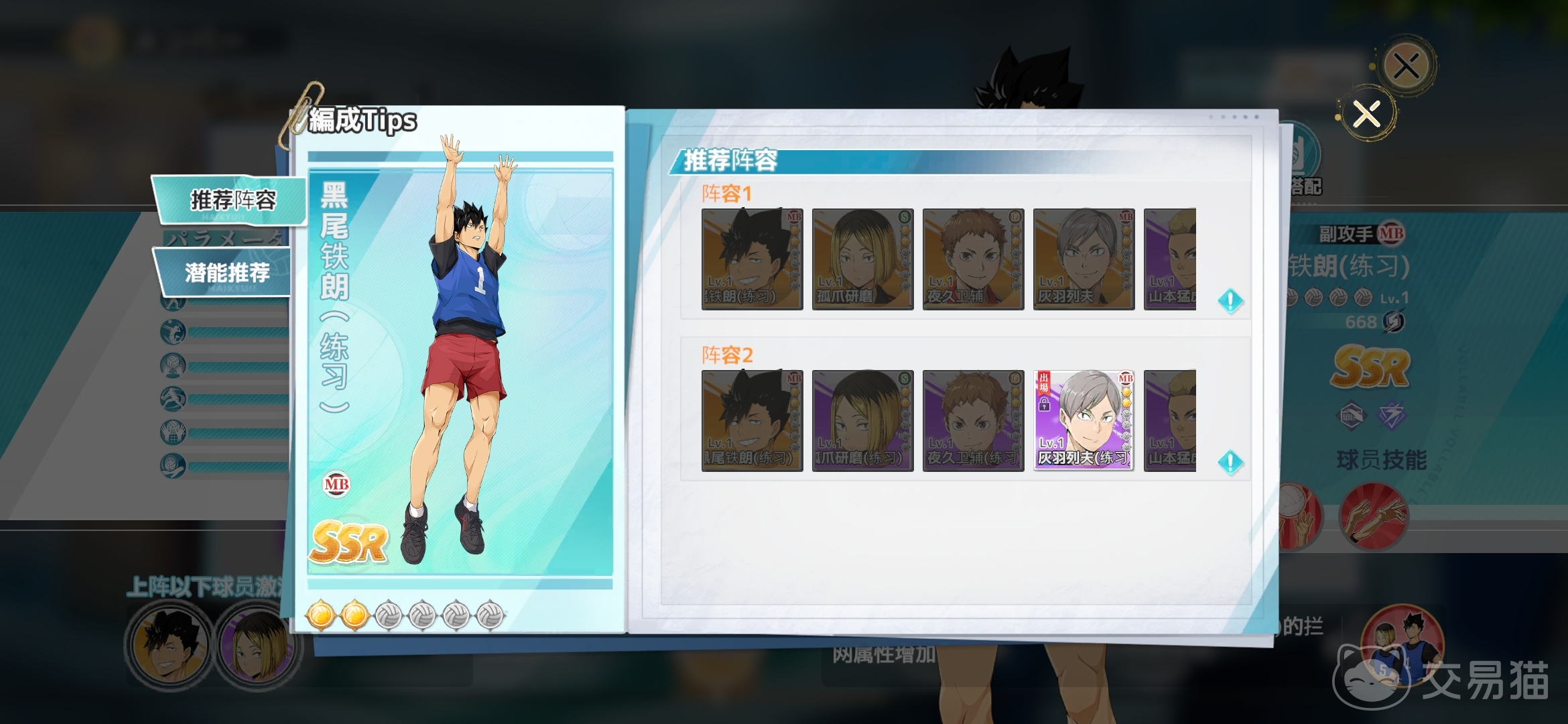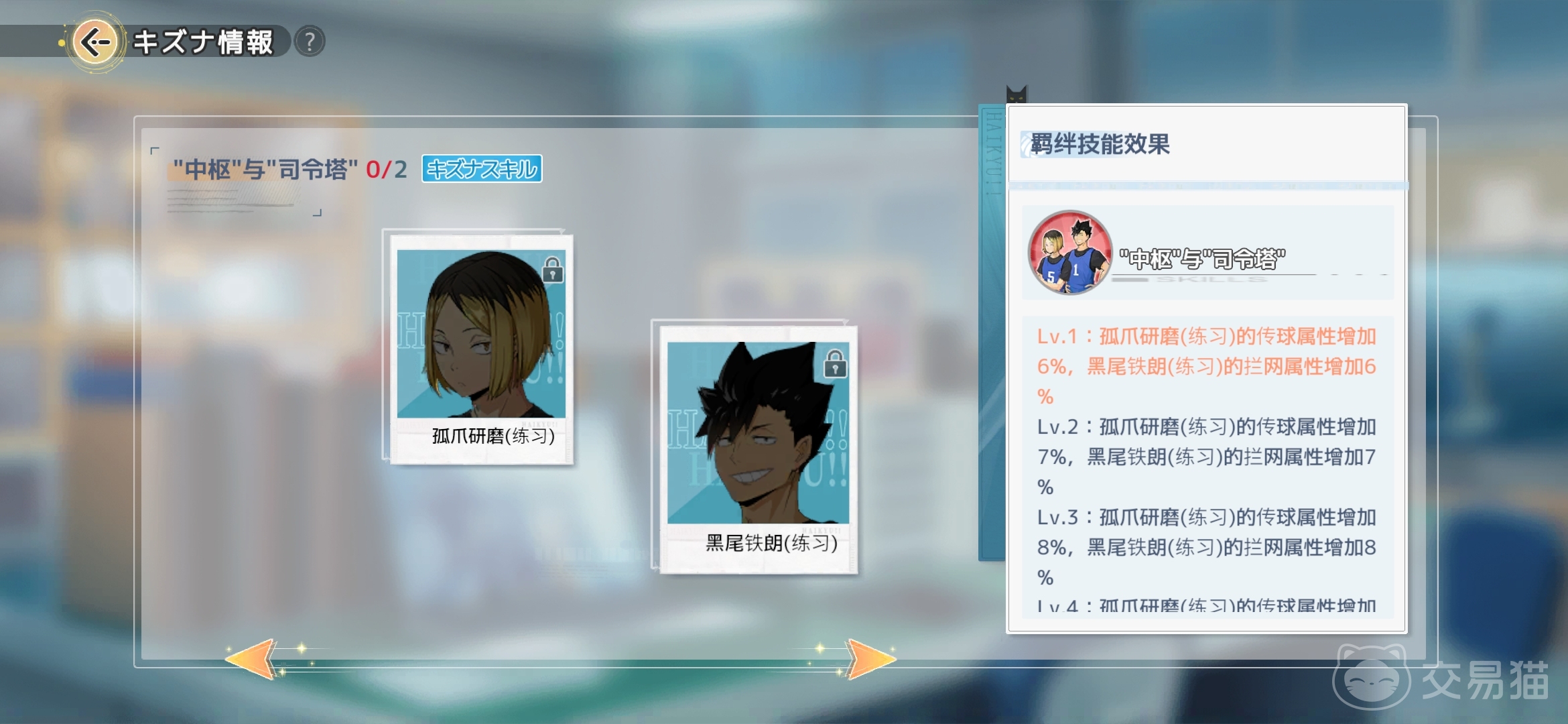 羁绊阵容搭配:背景故事中的黑尾从小就是和研磨家住在一起的,互相算是发小的身份,而与淹研磨本身就有着较强的默契,他俩分别在队伍中被称为中枢和司令塔,两人同时上阵研磨会增加传球属性,黑尾增加拦网属性;剩下几名平民可以搭配练习版研磨,夜久,灰羽和山本还有福永,这套阵容强势的点由于前期推图接球能力非常高,可以设置自动只要战力差距不大就能三星通关。
