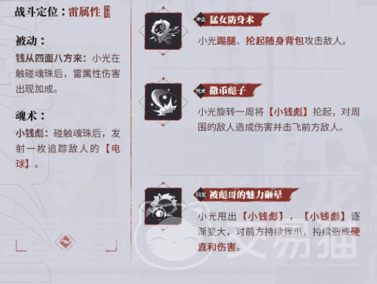 在技能方面,小光拥有多个强大的技能。她的被动技能“钱从四面八方来”让她在触碰魂珠后,雷属性伤害出现加成。魂术技能“小钱彪”可以发射一枚追踪敌人的电球,对敌人造成不小的伤害。此外,她还拥有冲击技能“猛女防身术”,可以踢腿、抡起随身背包攻击敌人。在咒术技能方面,“撒币彪了”是她的一大杀器,旋转一周将彪子抡起,对周围的敌人造成伤害并击飞前方敌人。最后,她的归龙技能“被彪哥的魅力砸晕”更是强大无比,甩出彪子逐渐变大,对前方持续挥爪,持续造成硬直和伤害。