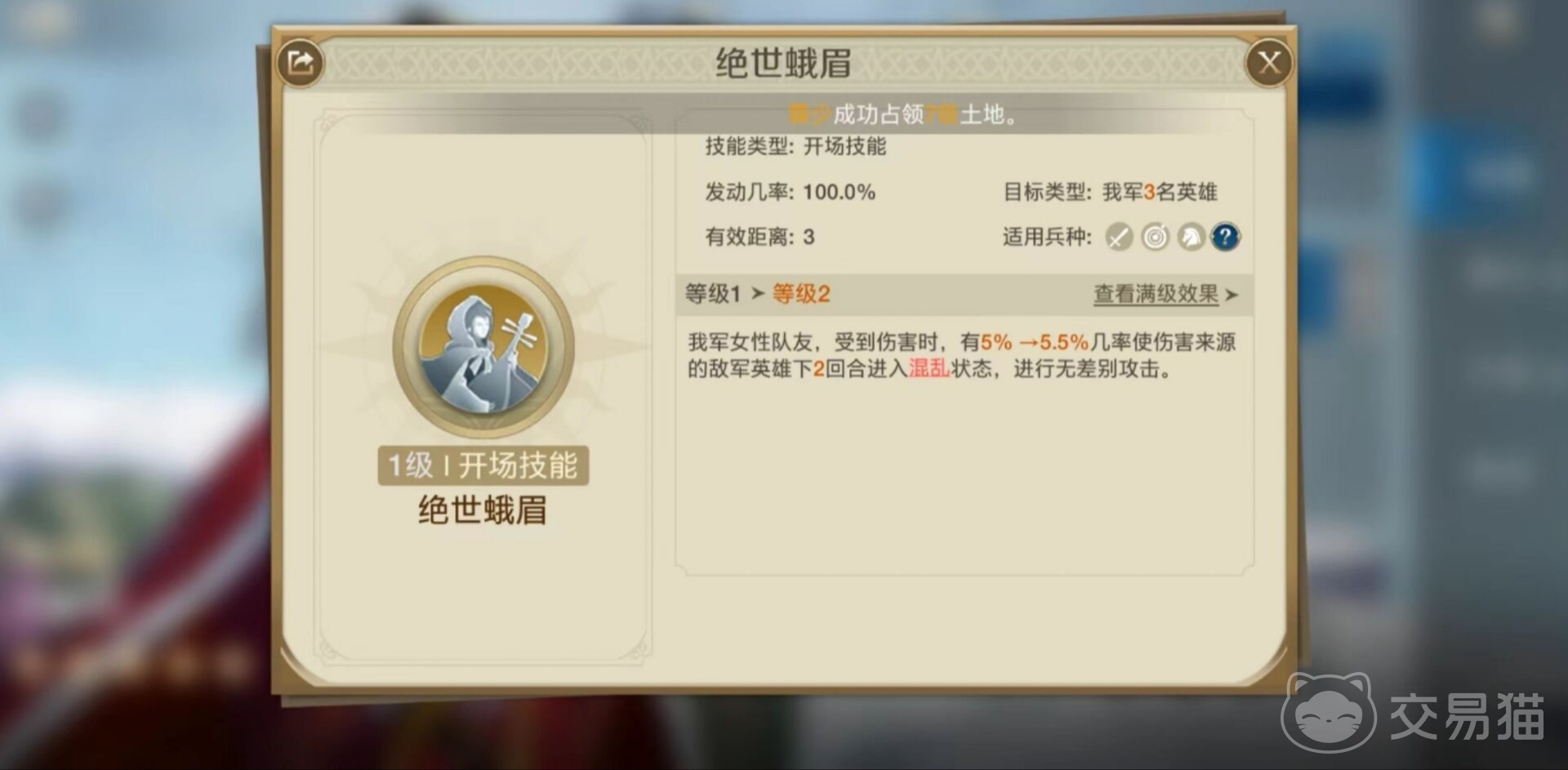 王昭君的自带技能绝世蛾眉是属于开场技能,这种技能在团战中是打先手的,对局回合开始之后王昭君的先手技能就可以率先释放,该技能在发动之后所起到的作用主要体现在女性队友的身上,女性队友在受到敌方的攻击伤害时,该技能有5%到5.5%的几率来降低敌方的伤害来源,还可以让敌方的英雄陷入到混乱的状态,敌人英雄一旦陷入混乱就会进行无差别的攻击,可以说王昭君的这个技能就是专门为女性队友量身打造的。