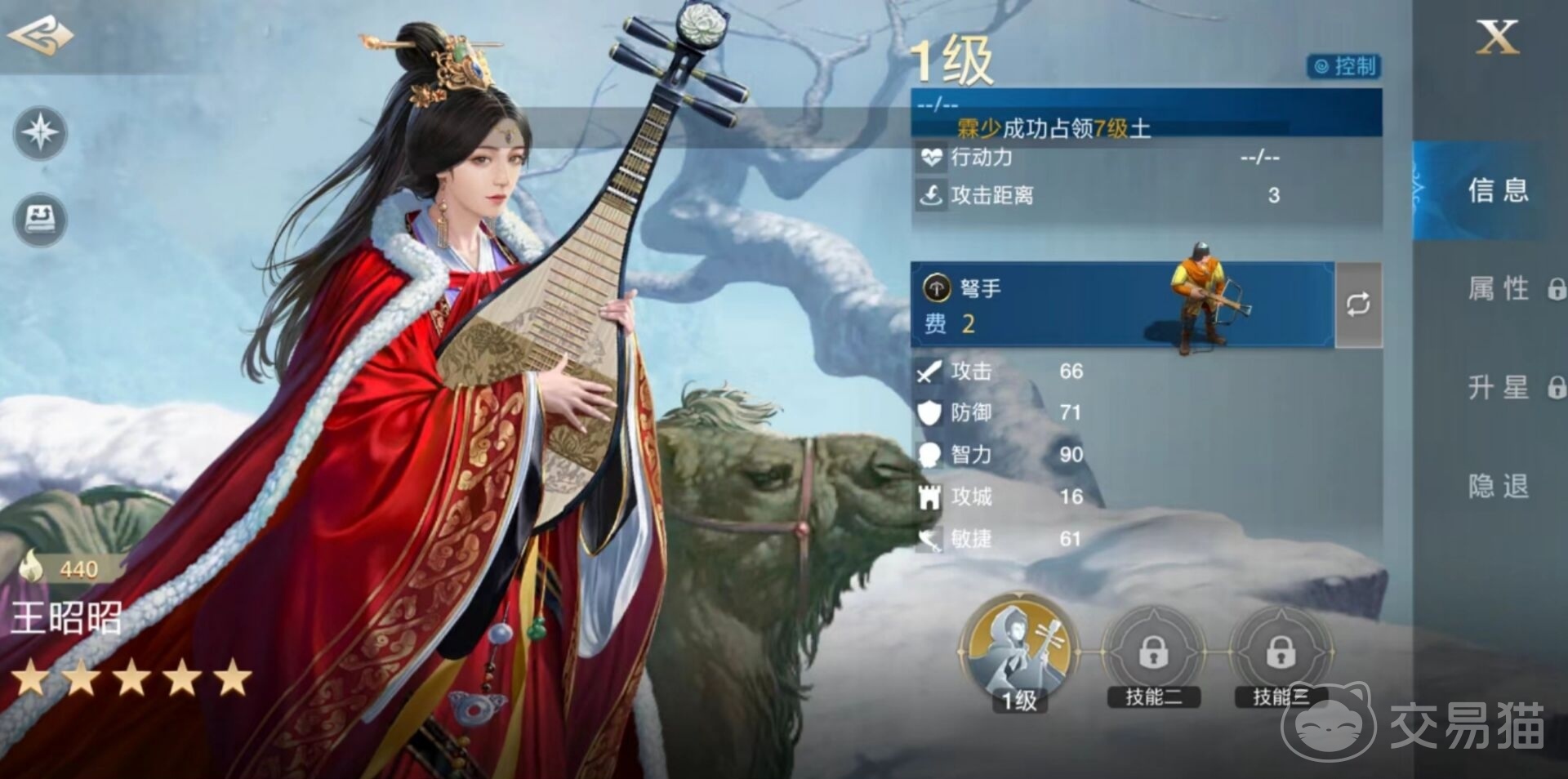 王昭君在世界启元华夏文明的武将阵容中是属于控制类型的角色,这个英雄在游戏中也是一个五星的英雄,这个角色在阵容中可以起到辅助队友的作用,在选择士兵种类时可以给王昭君配备弩手类士兵,有效的攻击距离只有3。