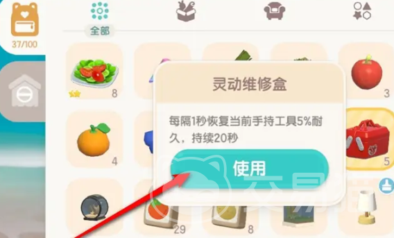 这是其中的一种方法,还有一种方法是直接使用维修工具,点击右上角的背包,可以找到维修工具。拿着工具来到维修的附近,马上就可以恢复耐久度。